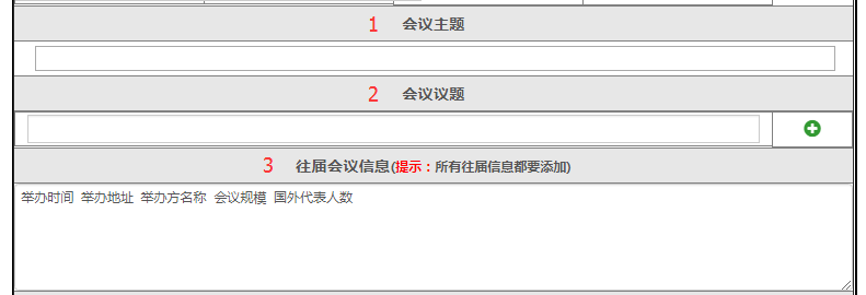 按钮添加多条议题记录。 - 请填写往届会议信息。包括举办时间、举办地址、举办方名称、会议规模、国外代表人数等。