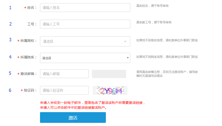 - 激活邮箱:请输入您的单位邮箱账号(无须填写后缀名)。此处只能填入单位邮箱,以核验身份。每个邮箱只能注册一次。