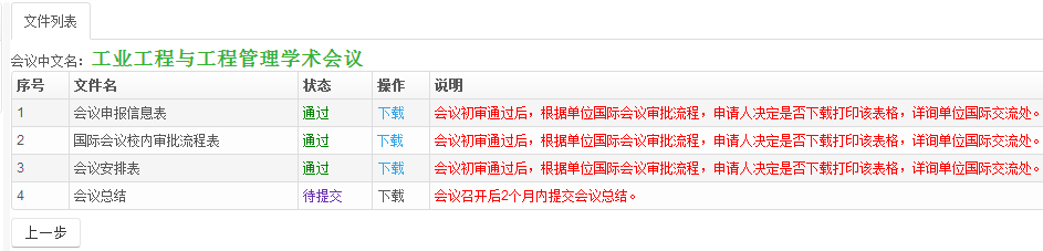 申请人在“文件下载”中下载会议申报信息表、国际会议校内审批流程表、会议安排表,提交所在校内二级单位党委负责人审核后,将校内流程表签字盖章扫描件发送oiec1@bnu.edu.cn 国际处邮箱。