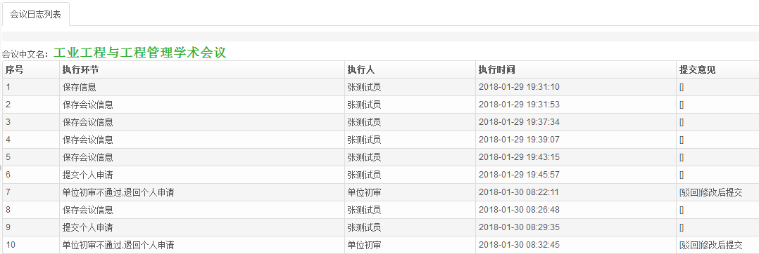 当会议的报批状态为“保存会议信息”、“个人申请”或“单位初审驳回”等时,用户可对会议申报信息进行修改和提交。