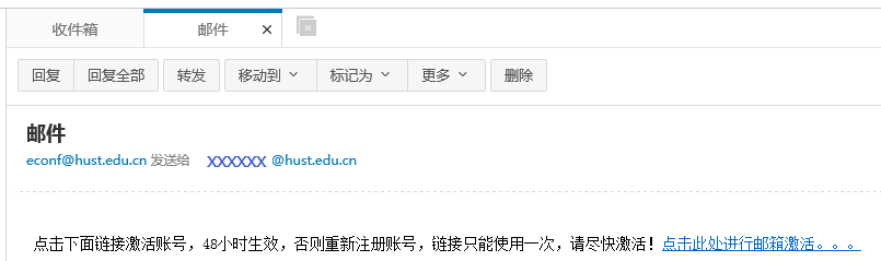 点击“激活”按钮,系统将发送一封邮件至您的单位邮箱。邮件包含了激活该账户所需要激活链接,申请人可以点击邮件中的激活链接激活账户。