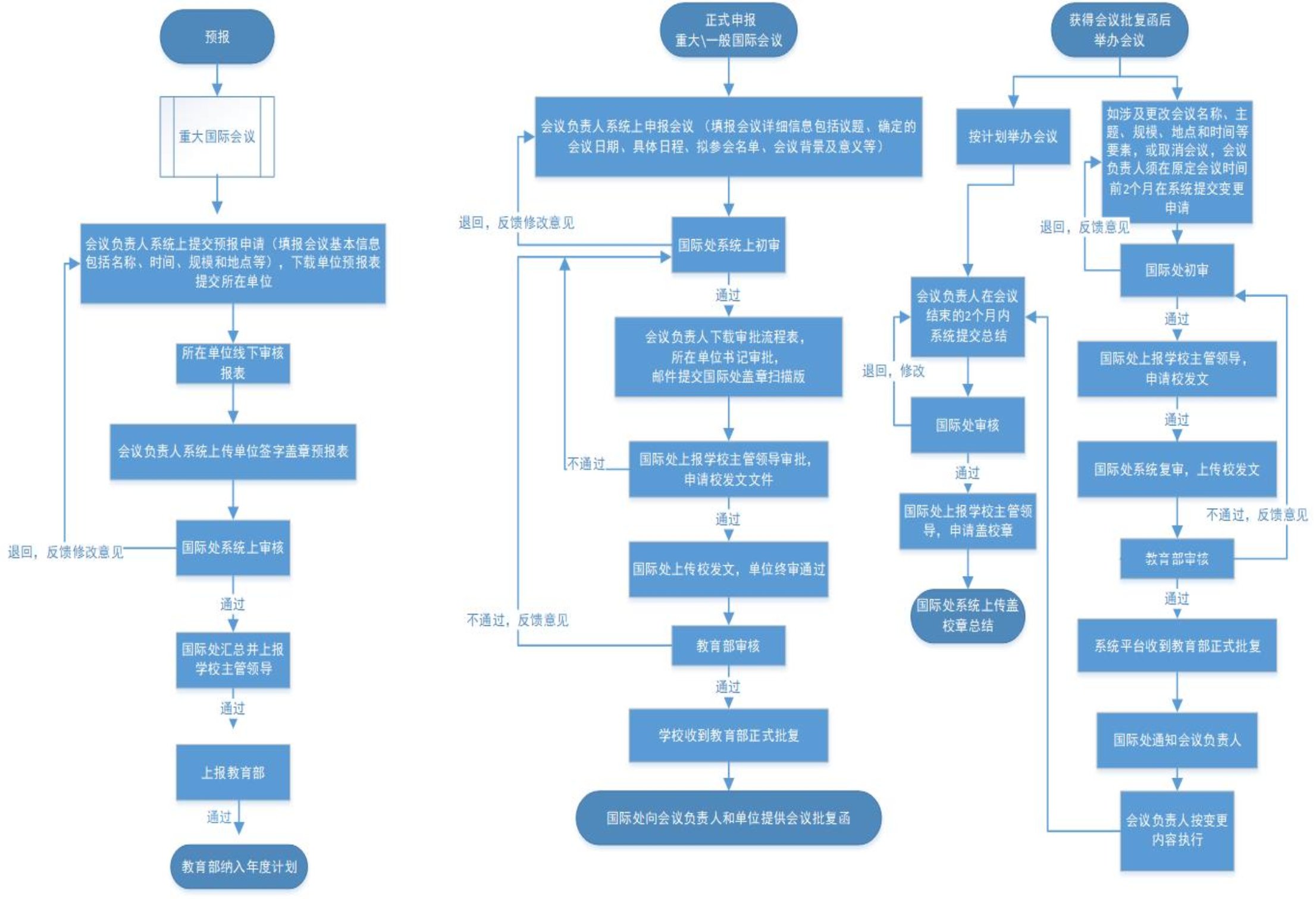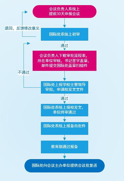 符合以上范围的会议学校自行审批并向教育部报备。校内会议主办单位须在会议举办日期前1个月在国际会议申报系统上报会议,审批流程如下: