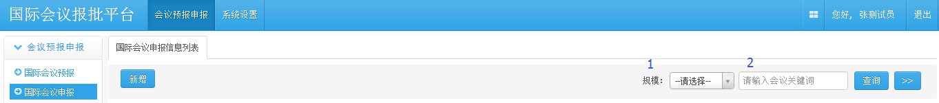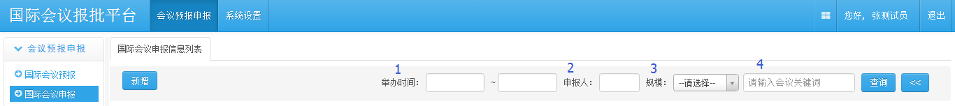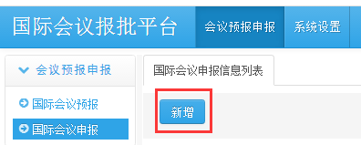 对于不用预报的一般国际会议,点击“国际会议申报”页面的“新增”按钮,即可新建一条会议申报记录。
