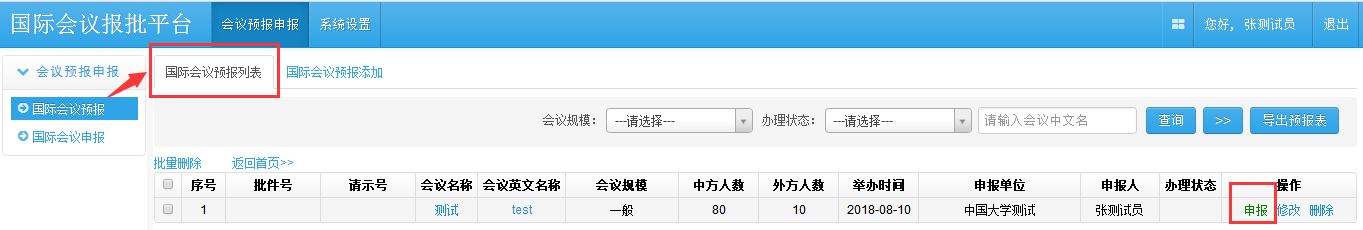 已预报的会议,从已通过的预报列表界面,点击“申报”按钮,开始填写申报信息。