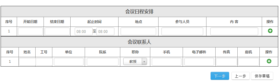 填写会议主要人员后,点击“下一页”,即可跳转到会议日程安排界面,可根据会议时间、参与人员、内容进行详细填写。