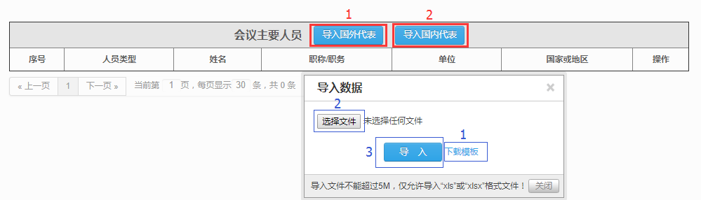 点击上图中红色按钮,弹出“导出或查看更多专家页面”。点击“导入国外代表”按钮,弹出对话框。若此前未下载模板,可先下载EXCEL模板,填写信息后选择该文件,再点击“导入”按钮,在该页面可看到信息已经导入。