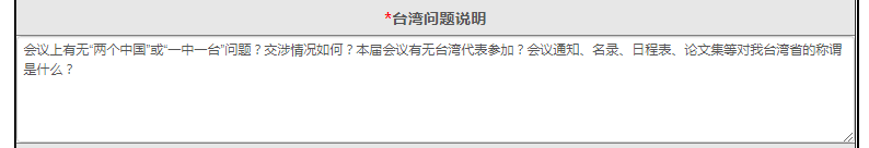 3、在会议的筹备及举办过程中,会议主办单位和学术负责人必须严格把关,将会议活动限定在学术讨论范畴,提前了解与会代表主要观点,防止出现敏感问题。请认真做好会议组织和预案工作,加强中方与会人员的保密纪律教育,切实做好会议期间网络安全防护和保密工作。防止出现"两个中国"和"一中一台"等敏感问题,尤其是会议的论文集和所有文字材料中不得出现此类问题。