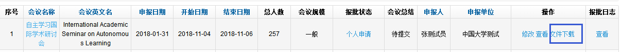 当添加会议申报完成后,自动跳转到国际会议申报信息列表界面,如下图所示。此条记录目前报批状态为“个人申请”。