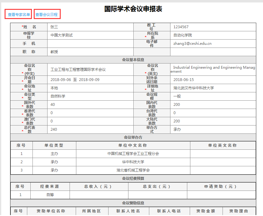 点击“操作”栏的“查看”按钮,可查看填写的会议信息。点击蓝色“查看专家名单”、“查看会议日程”字体,可查看相关信息。
