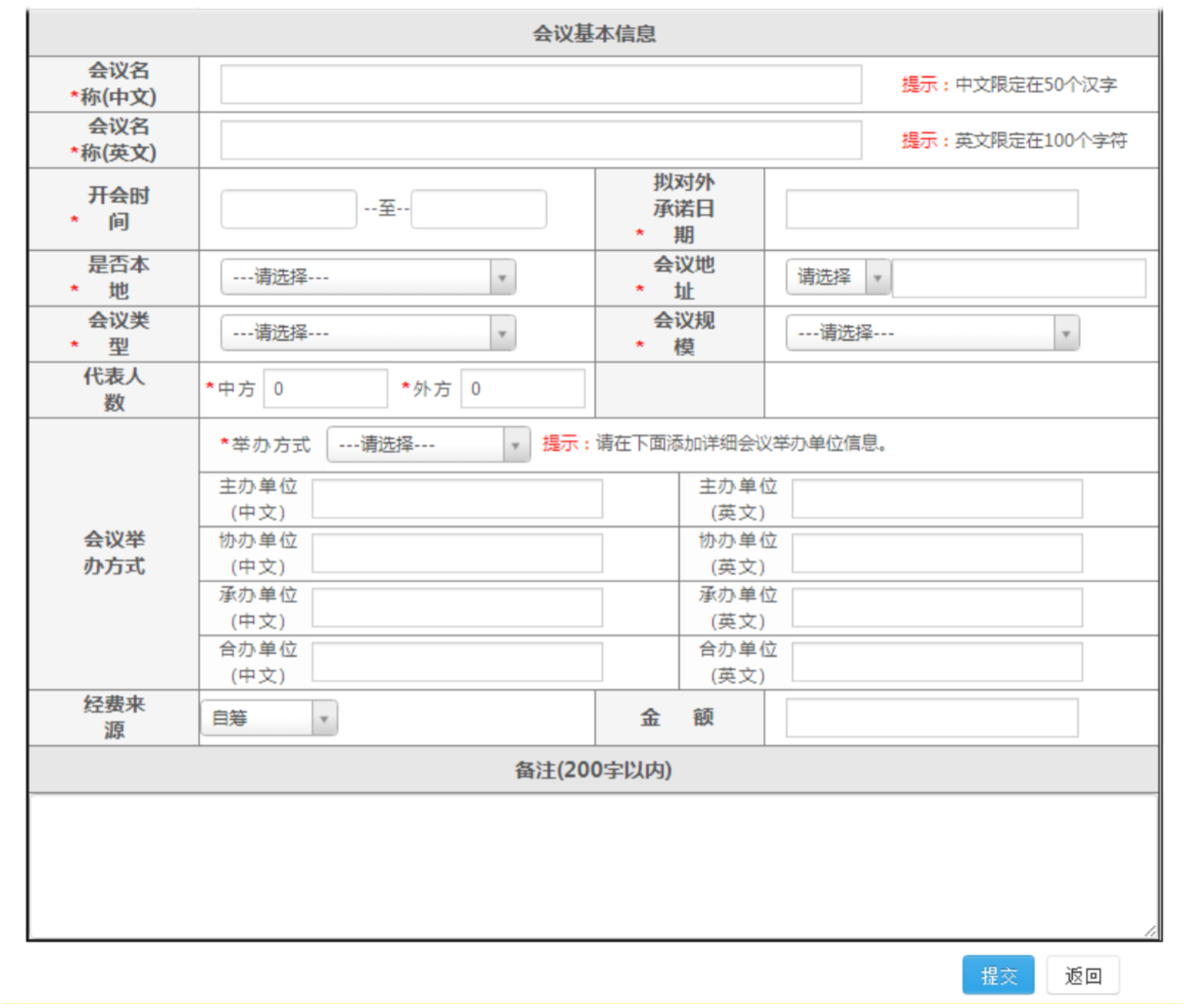 “会议举办方式”请据实选择,并分别填写主办单位、协办单位、承办单位、合办单位的中英文全称。主办单位:指会议的发起单位;承办单位:指会议的具体实施单位;协办单位:指会议实施过程中提供协助或赞助的单位。
