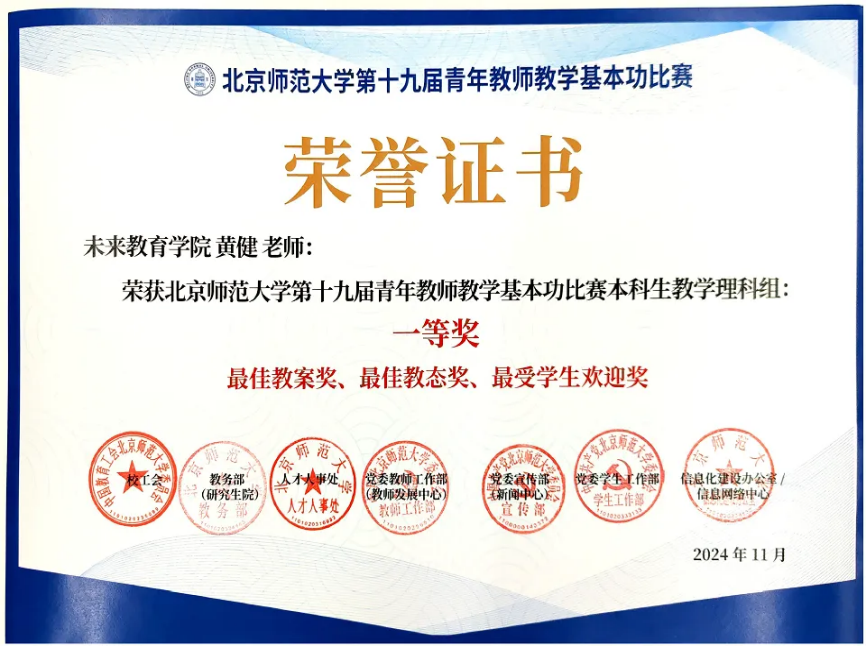 近日,必威西汉姆第十九届青年教师教学基本功比赛顺利举办,来自北京校区和珠海校区共31个教学单位的88名青年教师同台竞技。我院青年教师黄健在比赛中表现出色,荣获本科生教学理科组一等奖、最佳教案奖、最佳教态奖和最受学生欢迎奖等多项殊荣,展现了学院青年教师的扎实学养、卓越风采。
