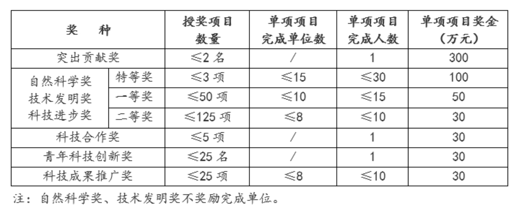省科学技术奖实行定标定额的评审制度,定标是指自然科学奖、技术发明奖、科技进步奖按等级提名,提名者应合理选择一个提名等级,评审落选项目不再降格参评;突出贡献奖、科技合作奖、青年科技创新奖、科技成果推广奖不分等级。详见下表: