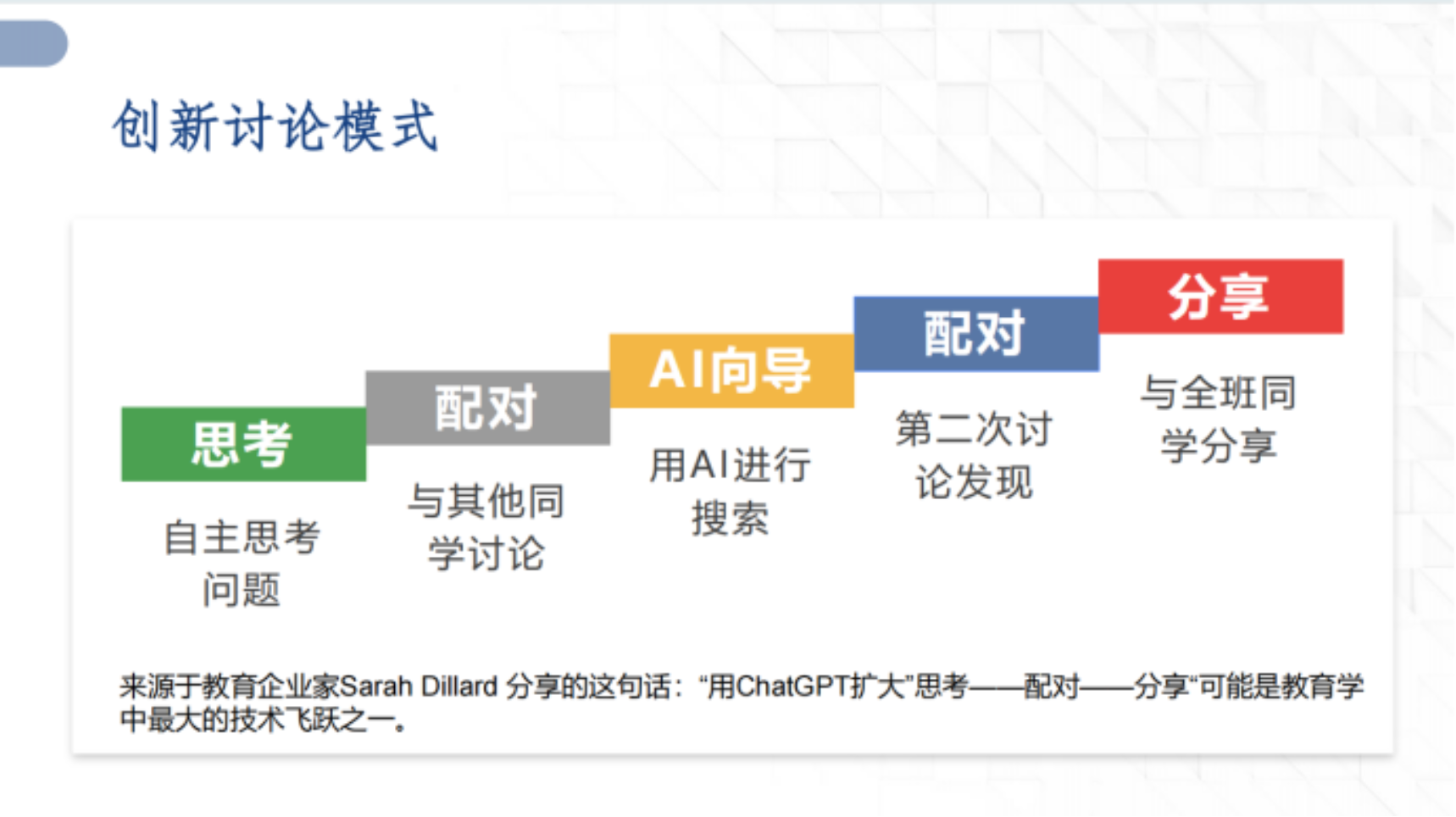 章仪老师介绍了CCIE人工智能教育创新实践研究项目的背景,进展情况以及今后与中小学合作开展教学实践研究的设想。采访了八位在生成式人工智能教育实践中走在前列的中小学教师,老师们提供了很多非常值得借鉴的实践经验和具体案例以及自己对生成式人工智能在教育教学中应用的一些思考,并还提出了AI赋能教育的行动研究方案,鼓励更多的老师不断尝试和探索人工智能在教育教学中的应用,促进实践创新和自身专业发展。