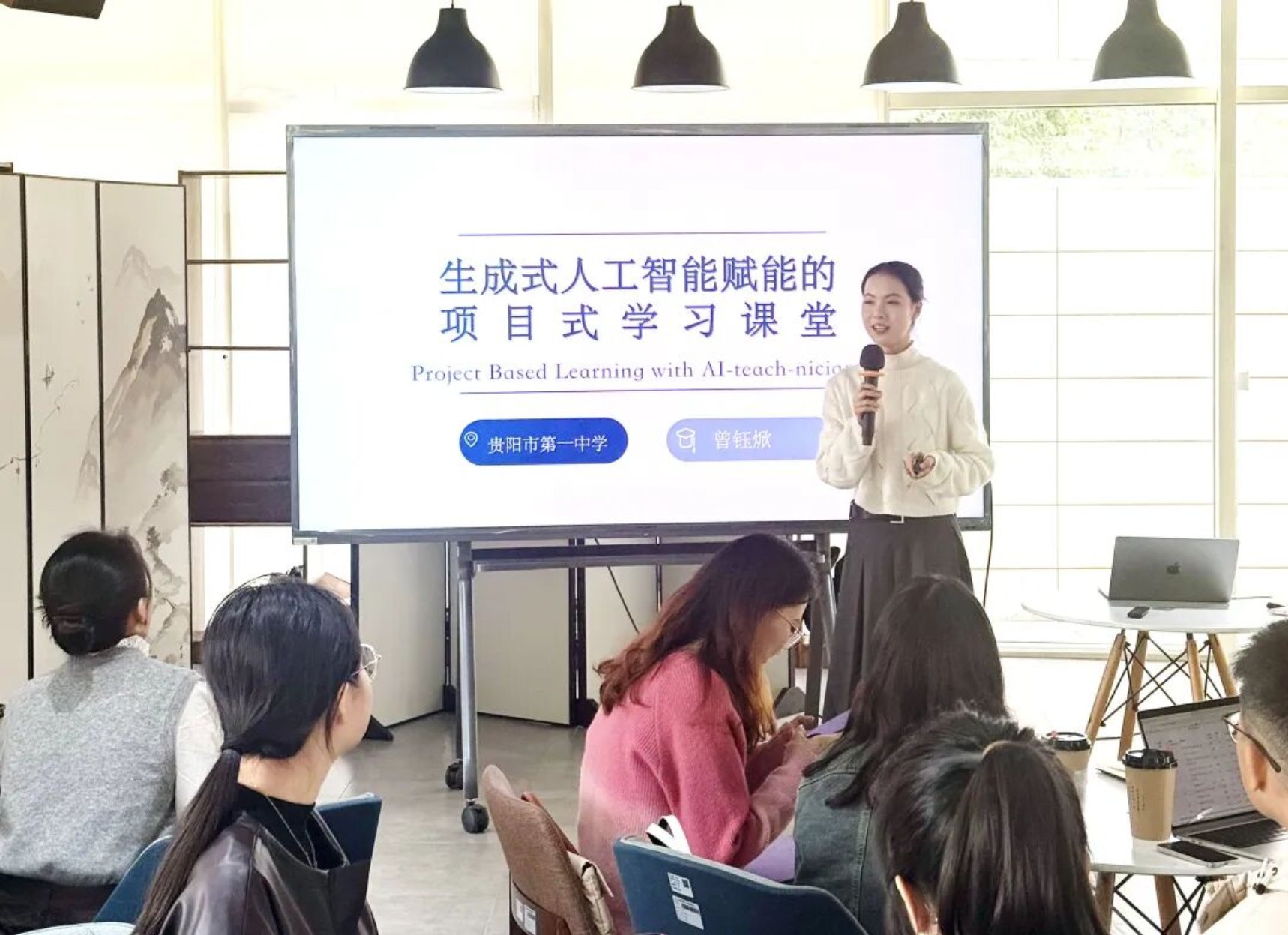 贵阳市第一中学的曾钰焮老师做了“生成式人工智能赋能的项目式学习课堂”的精彩分享。生成式人工智能赋能的项目式学习课堂(Project Based Learning with AI)是一种将生成式AI作为“助教”融入项目式学习的创新教学模式。在聚焦真实问题的项目式学习中,教师、学生、AI助教三个角色将互相影响,共同协作。在教师与AI助教的辅助下,该课堂能够助力学生科学地鉴别挑战、实时地获取反馈、高效地归纳信息、多元地探寻潜在解决方案、精炼并优化想法,并在测试过程中灵活调整解决方案。