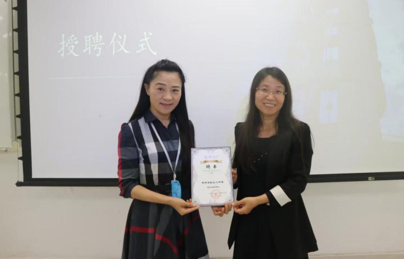 讲座结束后,盛双霞老师为邓虹老师颁发名师名校长工作室聘书。全体师生合影留恋。