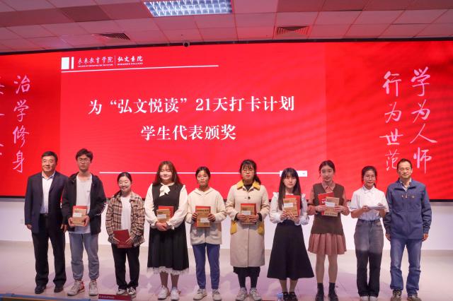 同样对读书充满热情的还有弘文学子,寒假期间他们积极参与为期21天的“弘文悦读”线上打卡活动,共有20余位同学勤于思考、坚持阅读、积极分享。启动仪式上,郑国民、刘亚军两位老师共同为学生赠送《民主与教育》一书以及李山、尚学峰、朱小健、刘亚军等四位教授的亲笔寄语作为纪念。