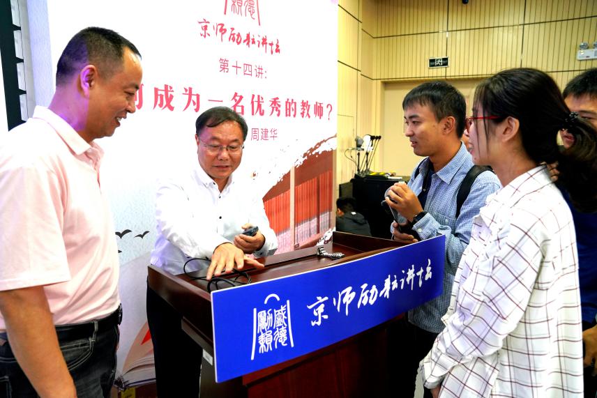 11月7日上午,京师励耘讲坛名师名校长系列第四讲在木铎楼A215举行。中国人民大学附属中学联合学校总校常务副校长、中学数学特级教师周建华博士以“如何成为一名优秀的教师”为题,结合自己的教学经历和现代教育理念给同学们带来了一场精彩的演讲。讲座由betway中国西汉姆联副院长孙波老师主持,杨明全老师、王琳明老师、陈星火老师和betway中国西汉姆联本科生、研究生等参加了此次讲座。