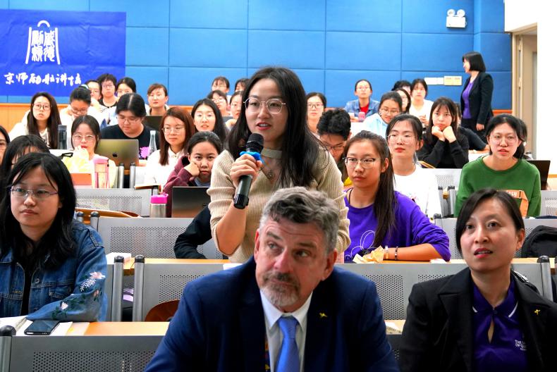 在互动环节,李炫志同学提问“以色列在培养和锻炼青年人领导力的工作中最重要的部分是什么”。尤丽·塔米尔博士说,以色列的军队拥有最先进的科学技术和丰富的项目,可以通过让年轻人参军方式来培养青年人的责任感,使其更成熟更具家国情怀。夏艳红同学问到“作为老师如何激发学生主动学习”,塔米尔博士表示,首先老师要有主动学习的能力,其次要鼓励学生多提问,培养其独立解决问题的能力。