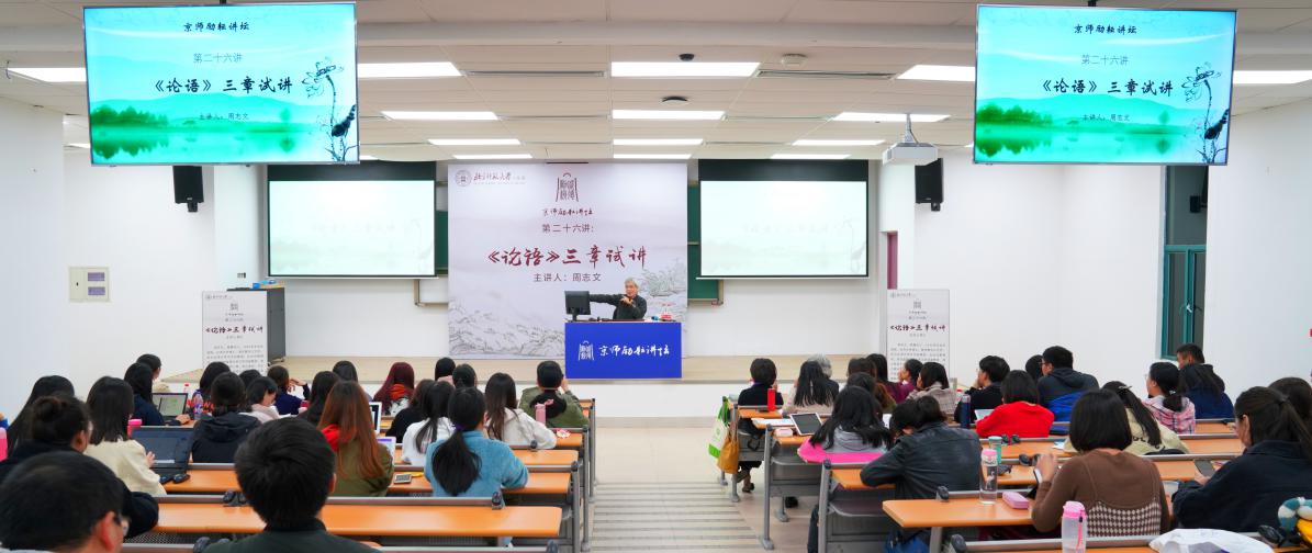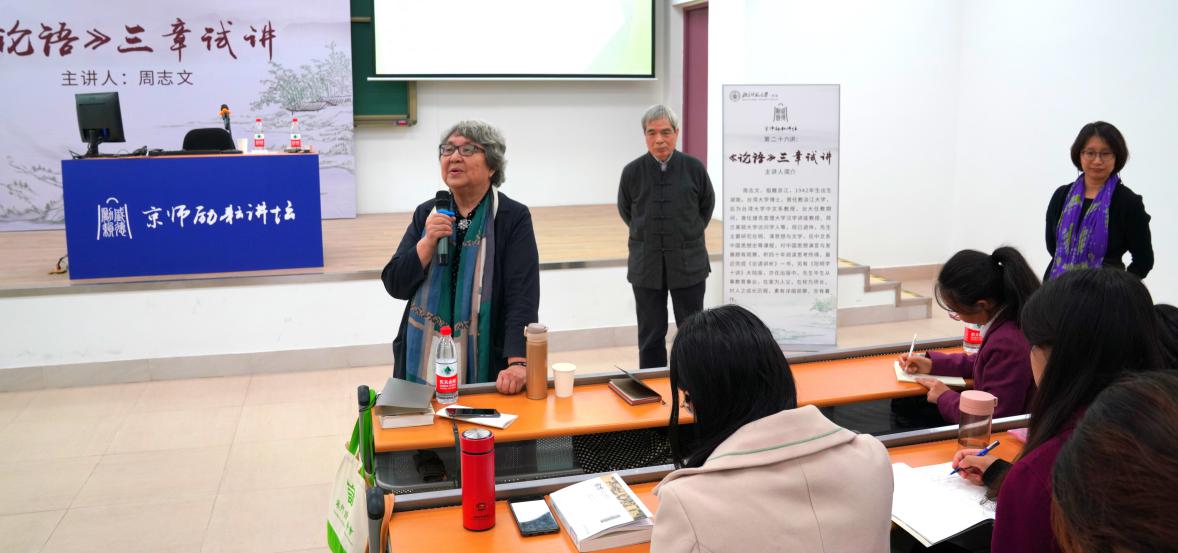 2019年12月4日晚上七点,京师励耘讲坛第二十六讲在励教楼B203顺利举行。台湾大学周志文教授以“《论语》三章试讲”为题带来一场精彩讲座,带领大家重新认识了《论语》与孔子。讲座由betway中国西汉姆联胡佳佳老师主持,王宁老师,朱小健老师,车欲晓老师,和betway中国西汉姆联本科生及研究生聆听了演讲。