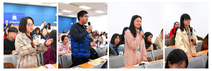 在互动阶段,学科语文专业的路雅雯同学说,曾经有一年的高考语文作文题是根据材料“小陈的爸爸老陈在回家的路上醉驾,小陈打电话给交警举报了自己的爸爸”写感想,论语中有“父为子隐,子为父隐,直在其中矣”,问周教授如何看待这件事情。周志文教授说,人与人的关系在古时候叫“伦”,分两种:带血缘的关系,如父子、兄弟、姐妹,叫天伦;无血缘的关系,如夫妻、好朋友,叫人伦。天伦讲的是不可奈不可改无可奈何,只可以用善的方式去呼唤天伦关系中的另一方的善。假如父亲不得体,子要接受要尽力维护父子之间的关系,并努力让他朝善的方式发展,这是子唯一能做的。脱离了父子关系,就等于没有父子了,每个人都没有父子关系了人类就没有了,道德就不存在了。所以根据孔子的思想判断,小陈的做法破坏天伦,不可取,这与法家的观点不同。思想政治教育专业的魏新统同学,物理专业的刘坤霖同学和英语专业的李浩玉同学分别请教了他们关心的问题,周教授慈祥地一一作了回答。