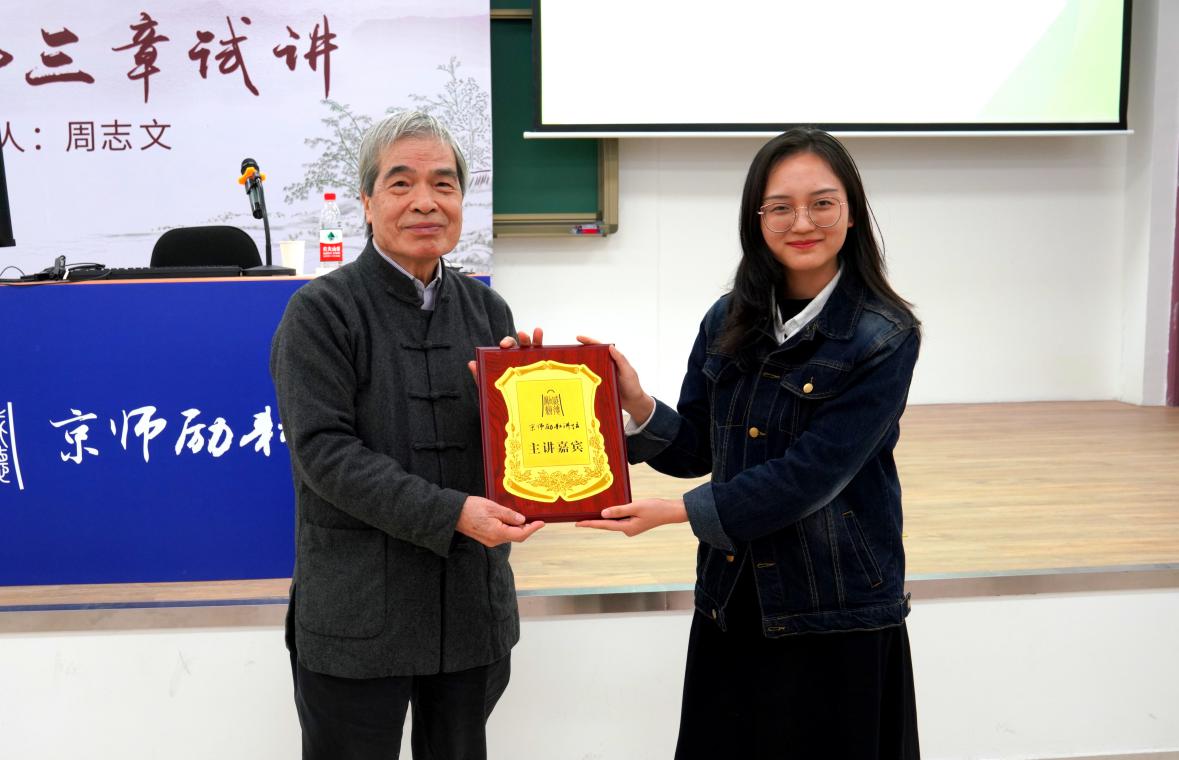 讲座的最后,袁婷同学代表学院为周志文老师颁发京师励耘讲坛嘉宾证书,讲座圆满结束。