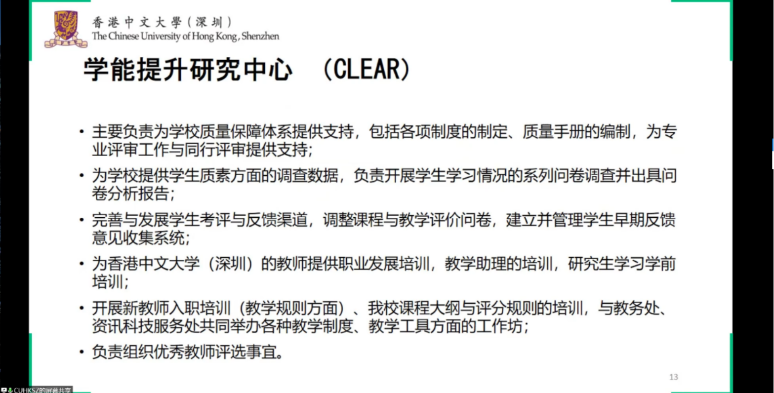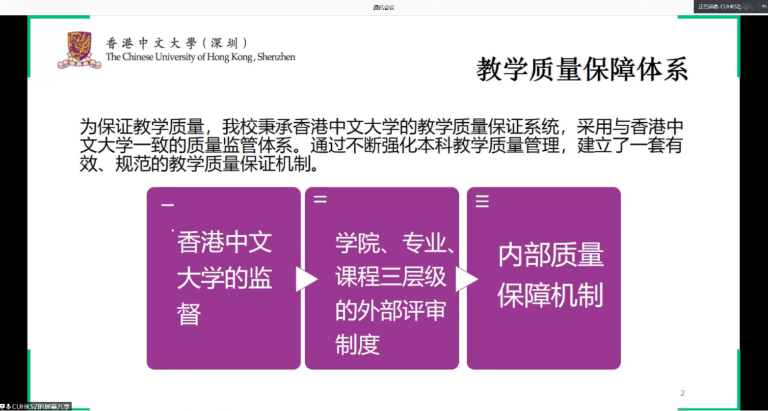 接着,香港中文大学(深圳)学能提升研究中心李兰教授详细介绍了香港中文大学(深圳)的教学质量保障体系。在两个层面上严格接受香港中文大学的监督,一是定期会议和年度汇报,由香港中文大学主管教育的副校长及学科规划专责委员会召集人与香港中文大学(深圳)主管教学、学术的领导共同组成学术委员会,定期召开会议监督管理学校的教学与学术事宜,学校每年向香港中文大学教务委员会提交年度报告与计划;二是接受香港中文大学的校际评审,香港中文大学校际评审小组就香港中文大学(深圳)质量管理体系的建设、课程设置、教师授课情况、学生学习情况等方面分别对管理层、各学院、书院管理层、教师代表、学生代表、以及不同的学术支持部门进行调查访谈,形成校际监督评审报告。