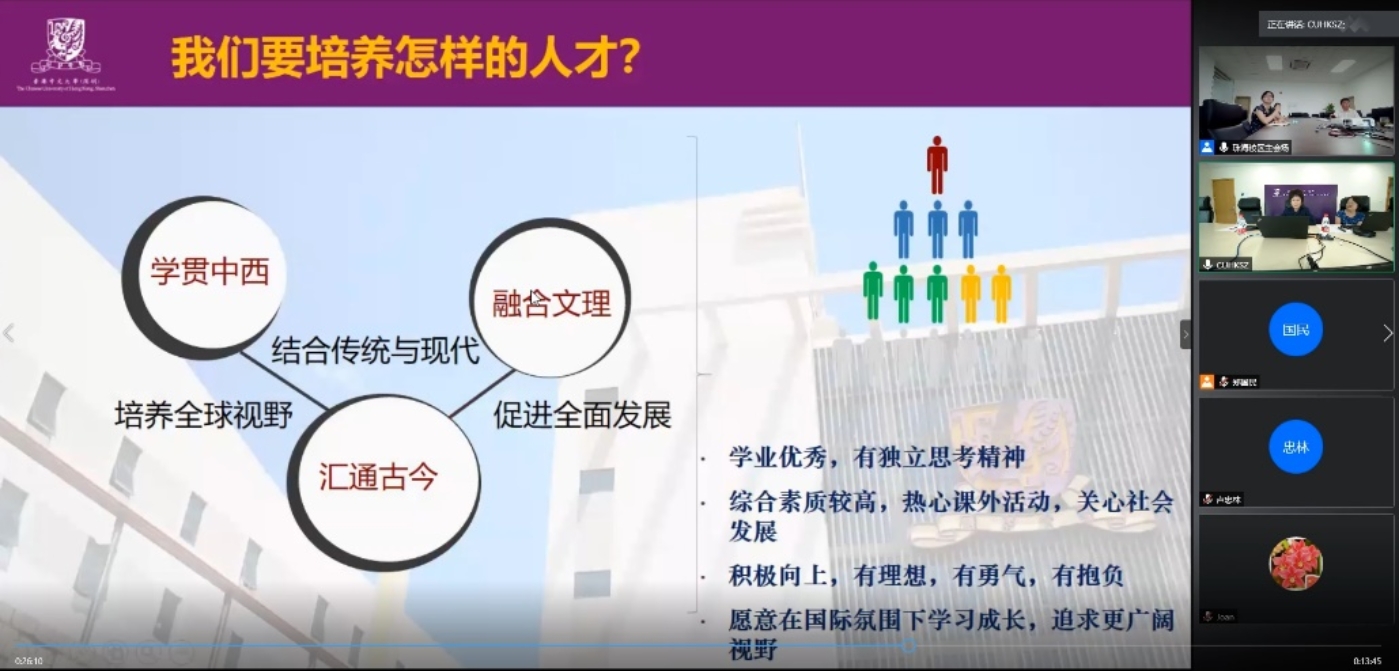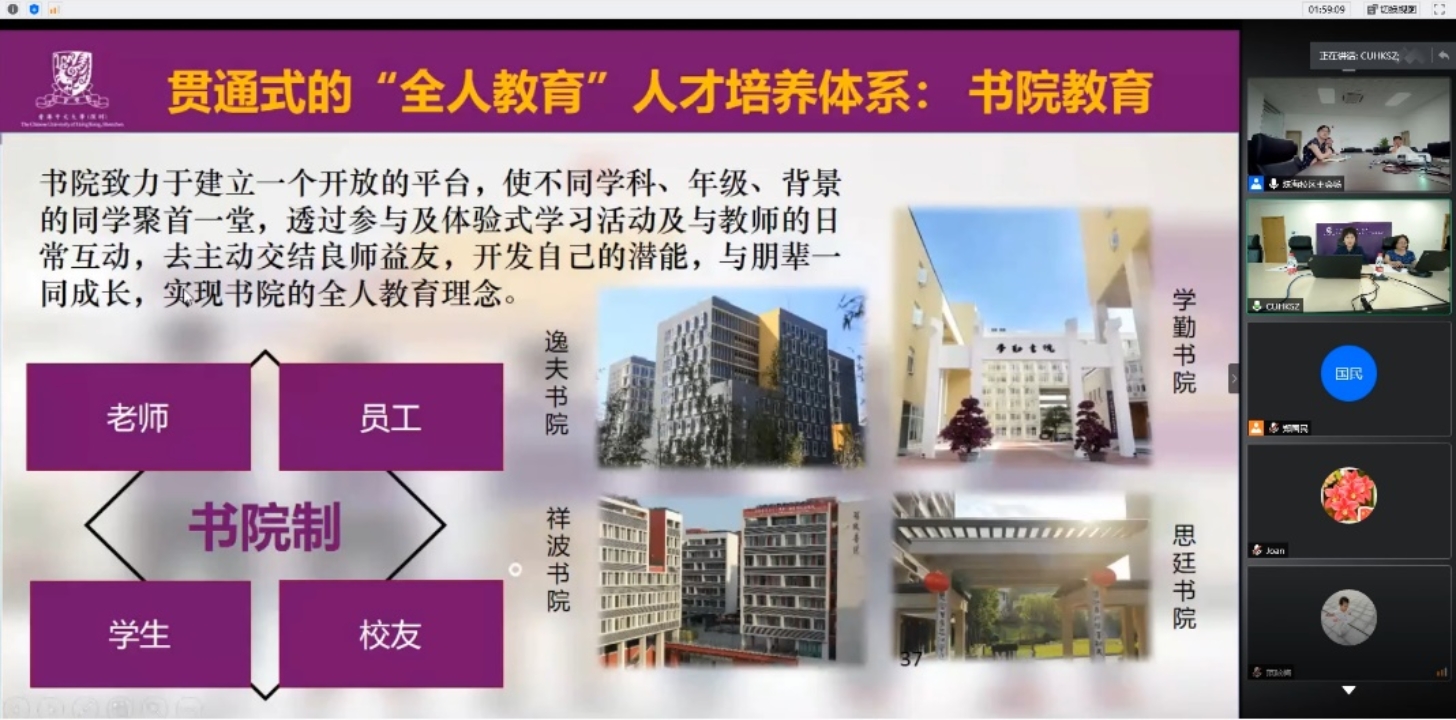顾阳教授分享了香港中文大学(深圳)在人才培养、学校管理方面的做法和经验。她介绍了香港中文大学(深圳)的发展历程、办学特色和教学环境,以及贯通式的“全人教育”人才培养体系和书院教育模式。
