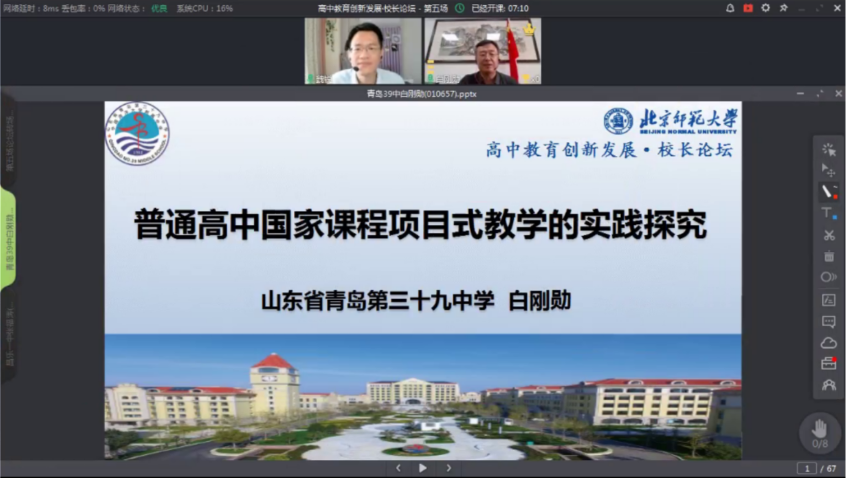 就推进项目式教学,深入实施课程和教学改革活动,白刚勋校长分享到青岛39中在学校机构设置方面,专门设立了教师发展中心、课程中心、学生发展指导中心,其中课程中心又下设海洋教育研究室、项目式教学研究室、传统文化教育研究室、艺术教育研究室;在制度保障方面,学校设立了20多项制度,保障项目式教学的组织和开展;在专家指导方面,9学科专家基于39中教师的实践、思考、设计和成果的基础上开展指导,而不是照搬研究成果;在教师的组织方面,39中3年通过6次大型研讨活动推动教师学习研究,在研究中转变观念,从而将全体教师的精力集中到研究项目式教学上。