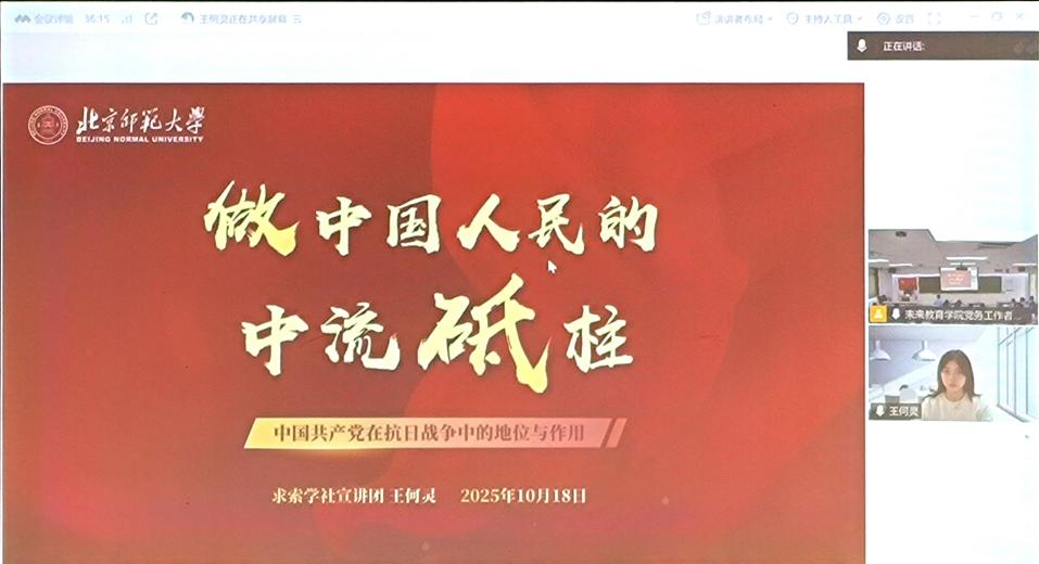 接着,马克思主义学院求索学社宣讲团王何灵同学为学员们作《“做中国人民的中流砥柱”——中国共产党在抗日战争中的地位与作用》的主题宣讲,按照时间脉络讲述了中国共产党在民族危亡之际的使命担当,带领学员铭记党的奋斗历史、传承伟大抗战精神。