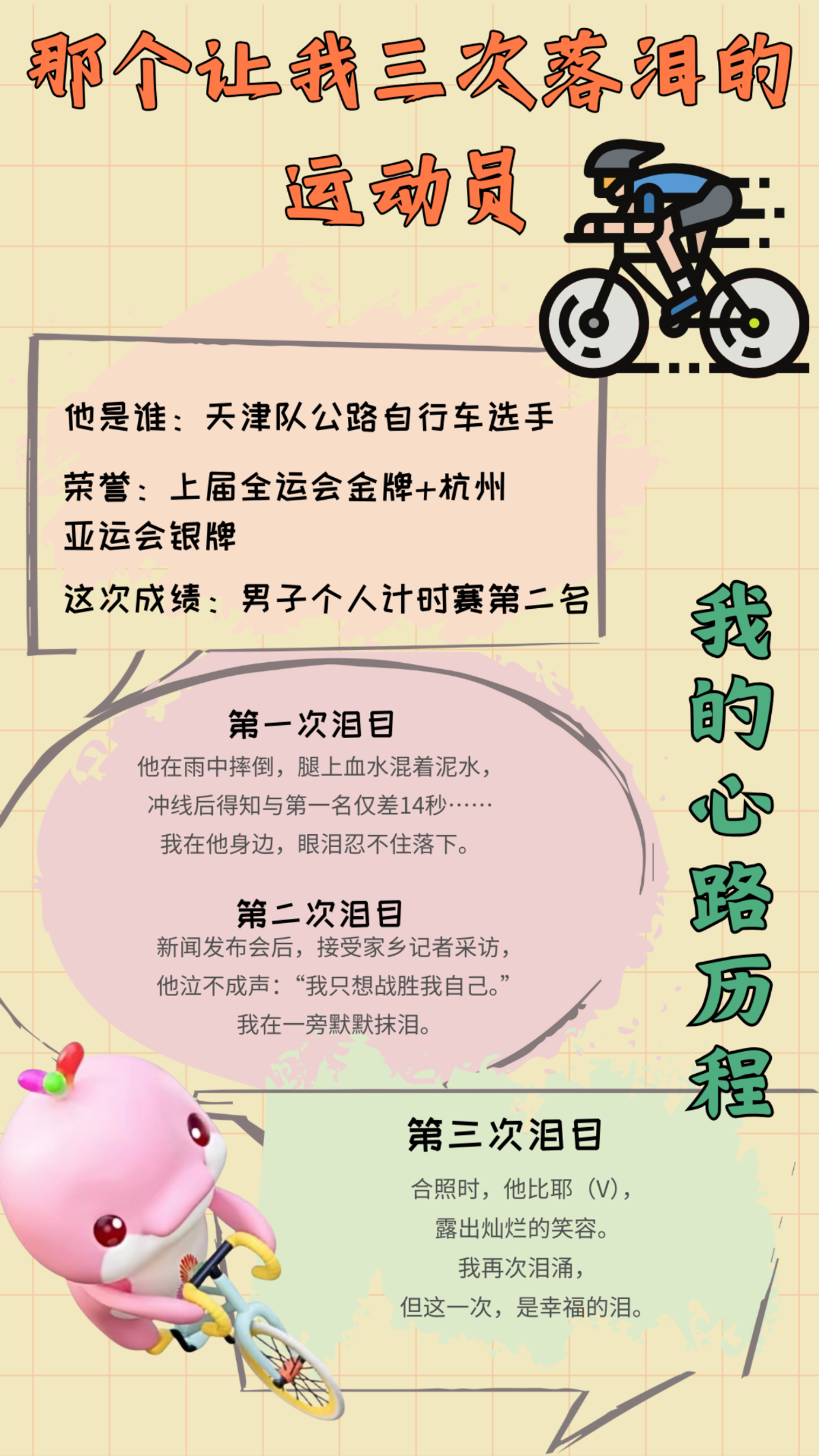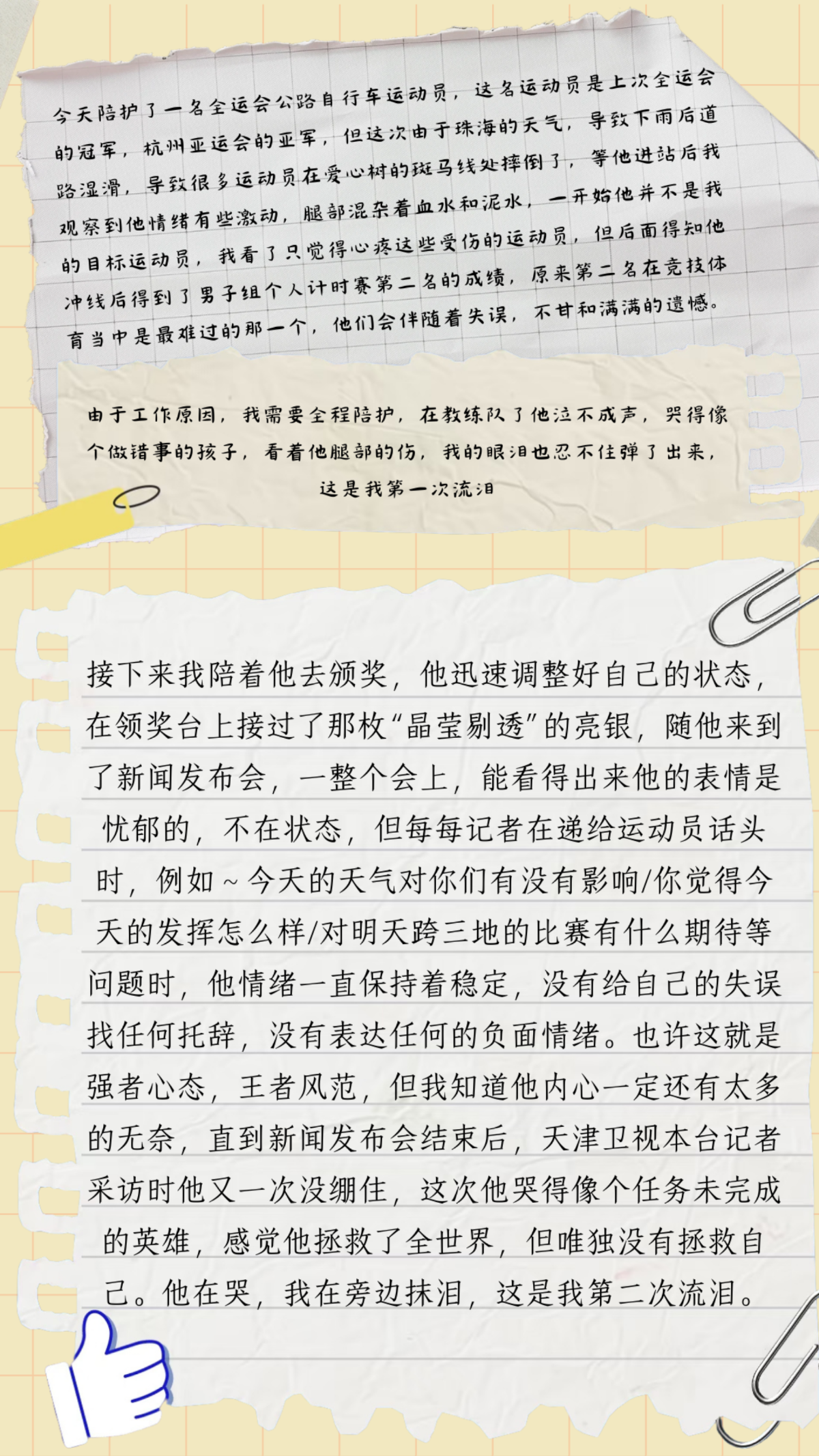 珠海雨天赛道湿滑,天津队上一届冠军摔倒后仍拼得亚军。张浩东同学全程陪护,见证他强忍伤痛领奖、坦然回应采访,终在镜头前释放情绪的瞬间。体育魅力不只在金牌,更在直面遗憾、战胜自我的强者风范。